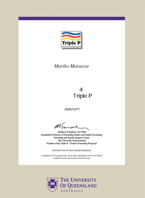 この度、Triple P 認定プラクティショナーとしての資格取得いたしました。